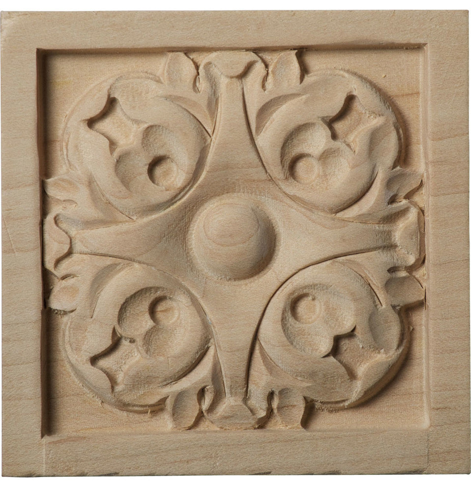 3 1/2"W x 3 1/2"H x 3/4"D Medium Leaf Rosette, Cherry. Our rosettes are the perfect accent pieces to cabinetry, furniture, fireplace mantels, ceilings, and more. Each pattern is carefully crafted after traditional and historical designs. Each piece comes factory primed and ready for your paint. They can install simply with traditional adhesives and finishing nails.