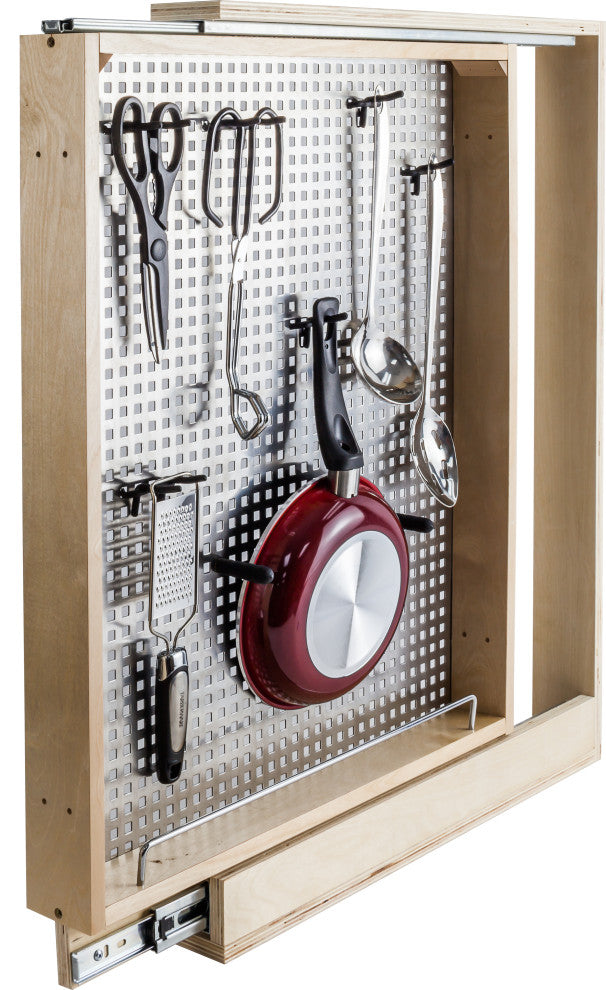 3" Base Cabinet Filler with Stainless Steel Peg-board Insert.Features Dura-Close Soft-close Full Extension Drawer Slides. Pullout Comes Completely Assembled with 12 Pegs and 18 Hooks • Each pullout comes with an assortment of pegs and hooks (12 pegs, 12 single hooks, 6 double hooks) • Additional hook packs are available for purchase (3 hook/pack) • Available in 2 width options • Stainless steel pegboard is easy to clean and magnetic • Available in 2 width options • Edgebanded birch plywood construction with clear UV finish