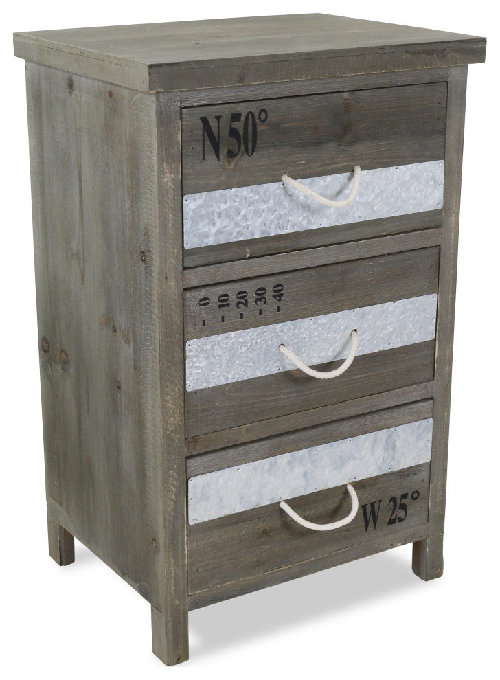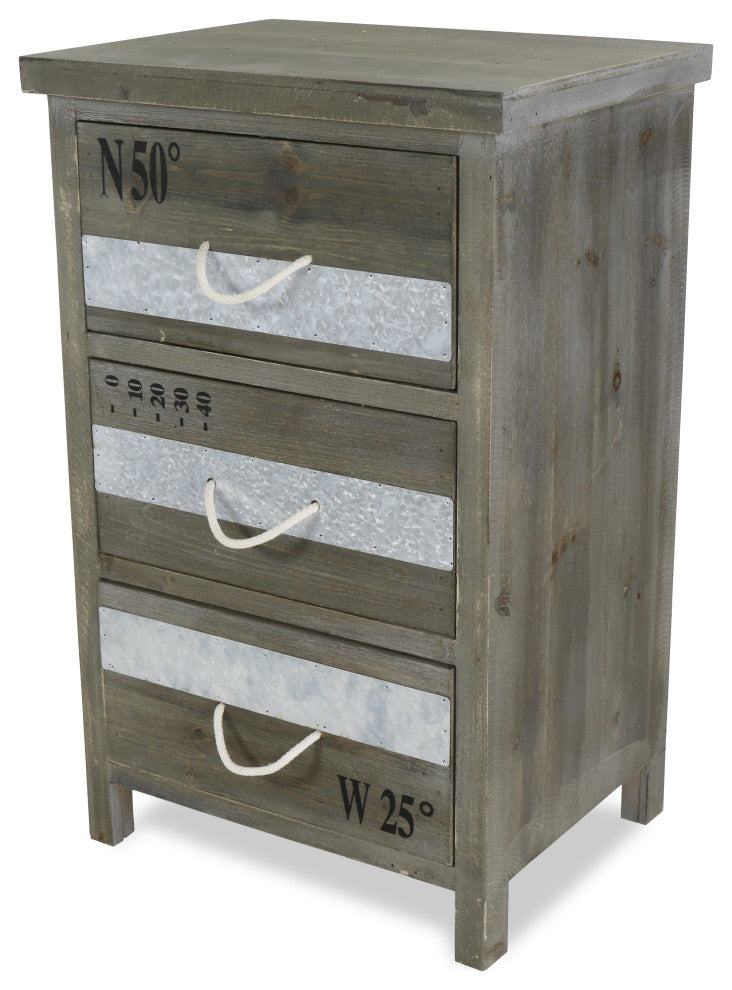 Add a touch of rustic, industrial charm to your home with the 3-Drawer Rope Handle Wooden Cabinet. A lovely addition to your living room or bedroom, the 3-Drawer Rope Handle Wooden Cabinet is eye-catching in design and versatile in function. Featuring three spacious drawers, the 3-Drawer Rope Handle Wooden Cabinet offers ample storage space perfect for clothes, linens and other accessories. Wooden drawers adorned with stenciled coordinates, rope drawer pulls and metal trim accents provide an additional layer of design depth and will effortlessly enhance your industrial, rustic or eclectic home decor.
