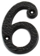 Durable wrought iron house number, designed to be long lasting against all weather conditions. Antique aged-black finish will never tarnish, completing the design of your home exterior. Matching Mounting Hardware included.