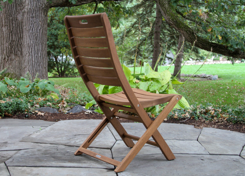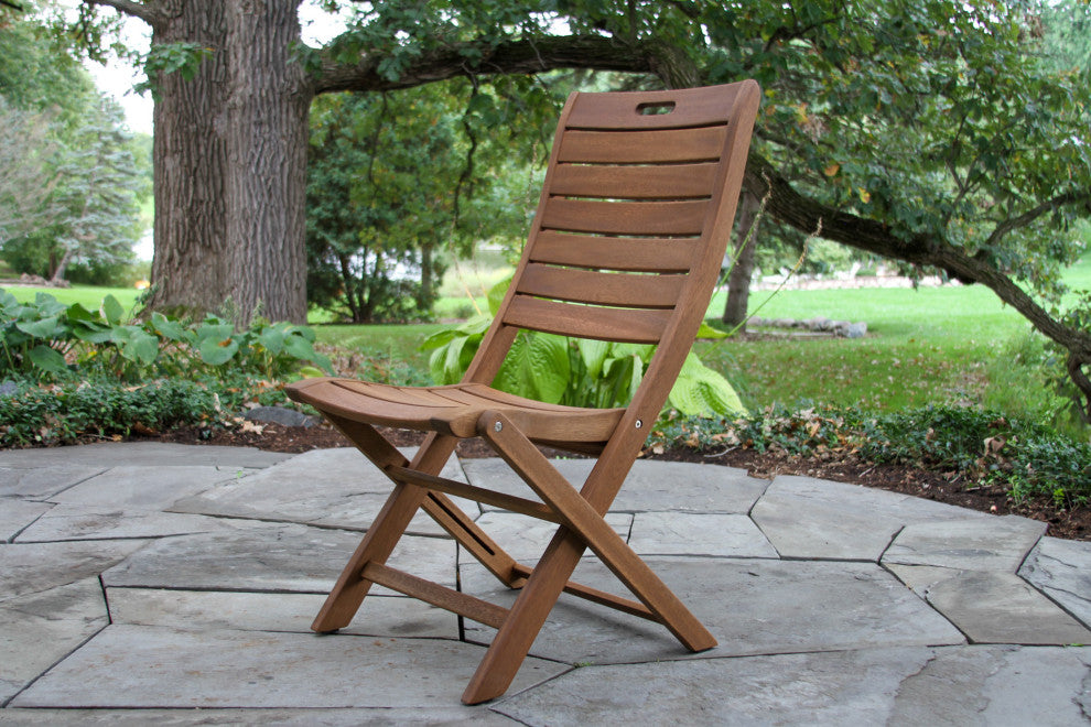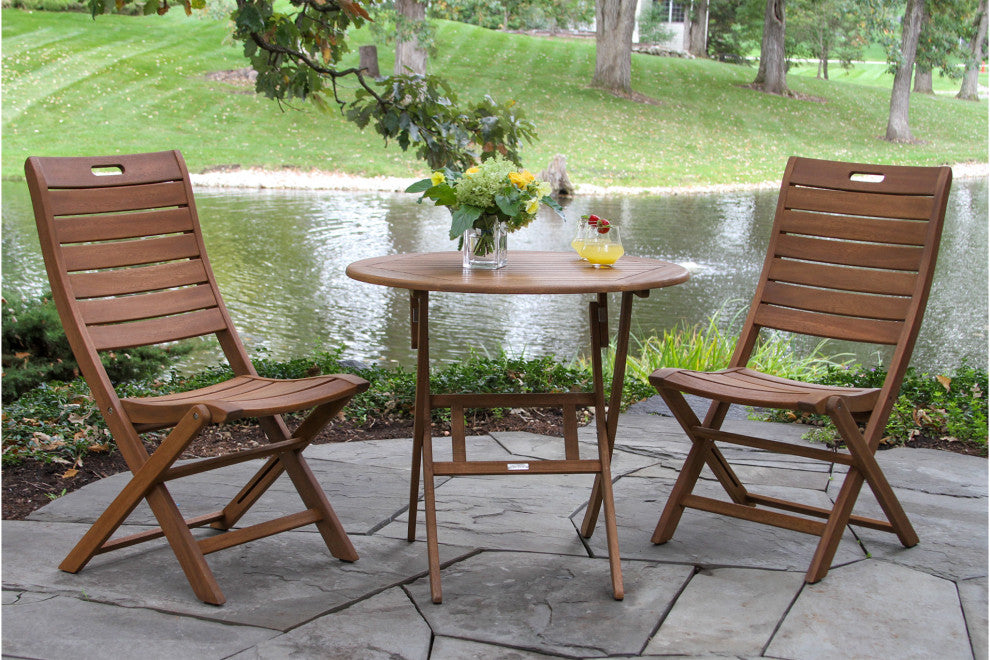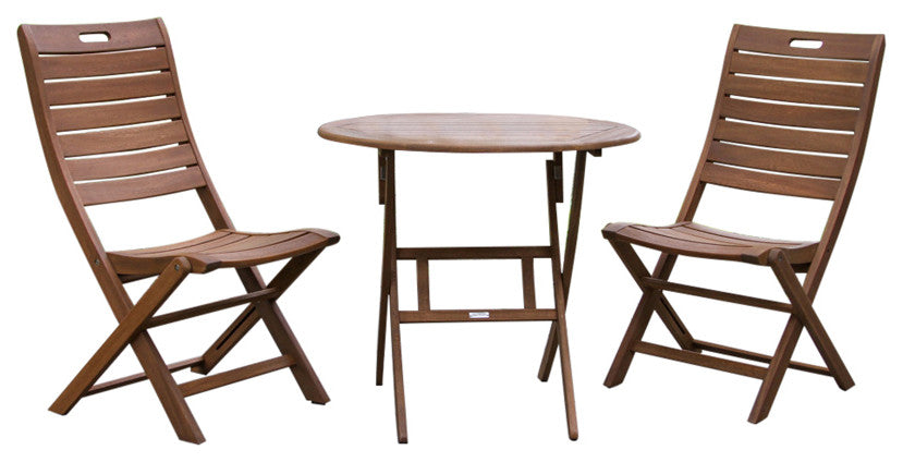 This charming 3-piece bistro set adds a cozy, natural vibe to your outdoor area. Its compact design makes it perfect for small porches or patios. Made from strong eucalyptus wood, this set can withstand various weather conditions and is resistant to water. The slatted design lets rainwater flow through, preventing puddles. The round table and side chairs can be folded for easy storage making the set simple to store away.What''s Included? 1 folding bistro table 2 folding chairs No umbrella holeFeatures Protective resin footpads Stainless steel hardware Table and chairs fold for storage The table does not fold fully flatProduct Details Materials: sustainable plantation-grown eucalyptus Table dimensions: 30" W x 30" D x 29.5" H Chair dimensions: 20.5" W x 21.5" D x 38" H Seat dimensions: 16.5" W x 15.5" D x 17" H Weight capacity: 250 lbs. Color: Umber brown stainProduct Care To maintain the stained finish of your Eucalyptus furniture, we recommend teak oil or refined/boiled linseed oil to be used in the spring and summer. Always cover or store away your furniture during harsh weather and winter.