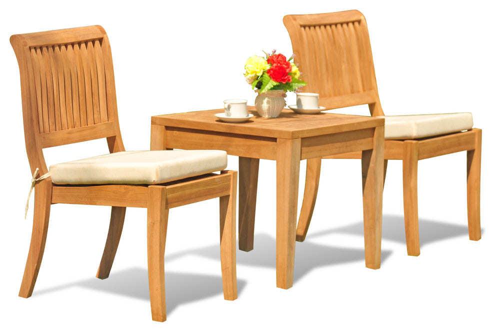Set includes: Square Table and 2 Stacking Armless ChairsThe chairs will stack for convenient storage in limited spaces.Stainless steel is also used to complement the beauty of teak in the construction of our furniture.All critical connections are made in the traditional mortise-and-tenon joinery with the strictest tolerances. We use only select kiln-dried teakwood.Sunbrella Fabric Cushions are sold separately.Assembly: Chairs comes fully assembled. Table requires very little assembly (Hardware and instructions included). Assembly is quick and simple.Please search Houzz for our tailor made, high quality cushions for this furniture set by looking for "Sunbrella Fabric Outdoor Cushion" in the Houzz search tool!Table Dimension: 23.5" Square, 22" HeightStacking Armless Chair Dimension: 18.5" Width x 19" Depth x 34.5" Height; Seat Dimensions: 17" Width x 17" Depth