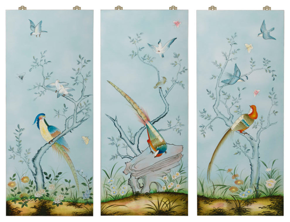 Commissioned by an artist in China, these panels were crafted and painted by hand with great attention to detail. The scene depicts golden tailed pheasants in a garden landscape. Simple and elegant, this work of art makes a great focal point while adding a light touch of spring color to any room. For your hanging convenience, brass hangers are included. Sold as a set of three; each panel measures 20"W x 48"H. Due to the hand painted nature of this piece, color may vary slightly with each set. Please allow us to select for you.