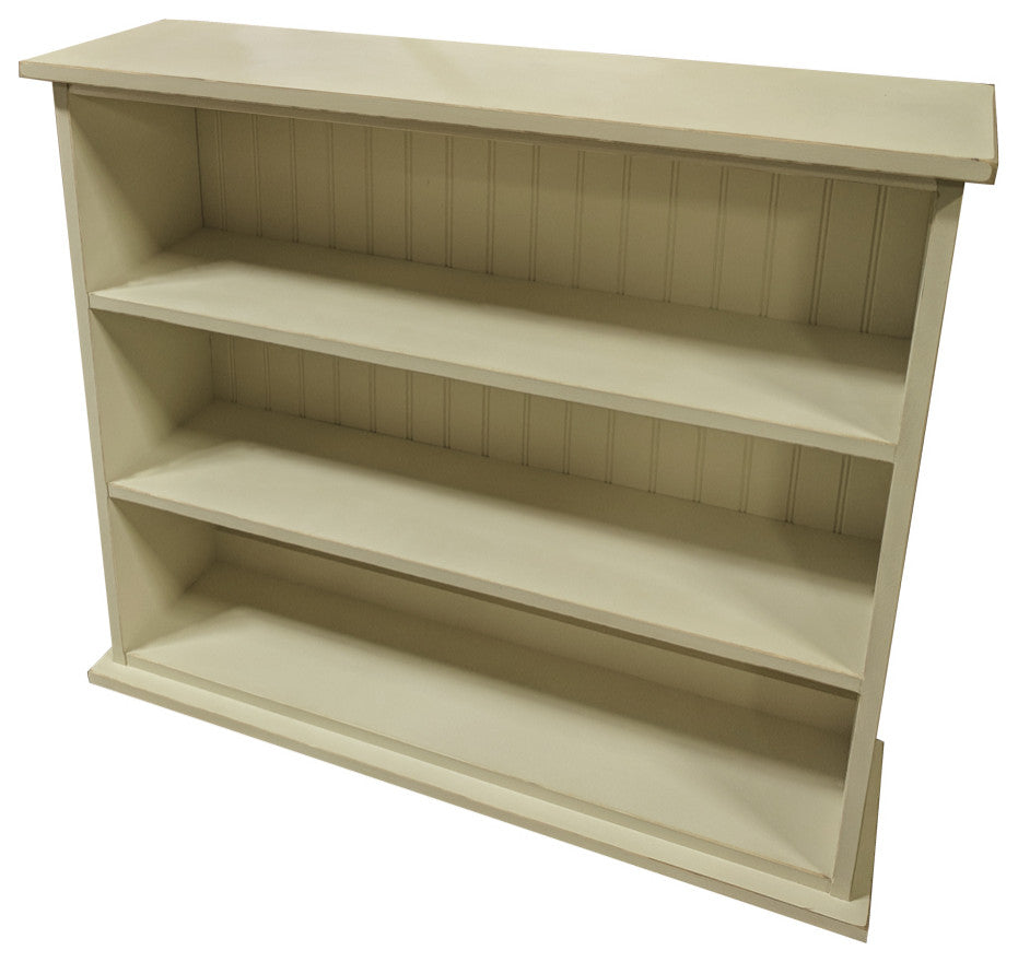 Solid pine 3 feet wide 3 shelf bookcase with beadboard back.Features:Handmade from solid knotty pineModest and rustic in the tradition of cottage style furnitureOverall dimensions: 36" W x 10" D x 32" H3 openings allow for 33"W x 8.5"D x 9"HMinor assembly required - instructions included. We do not use highly processed wood; because of this, you can expect knots and minor imperfections that make each piece unique.Our "Old" finish is a single coat of paint with light distressing to create a warm, aged look.Our "Solid" finish is two solid coats of paint with no distressing.