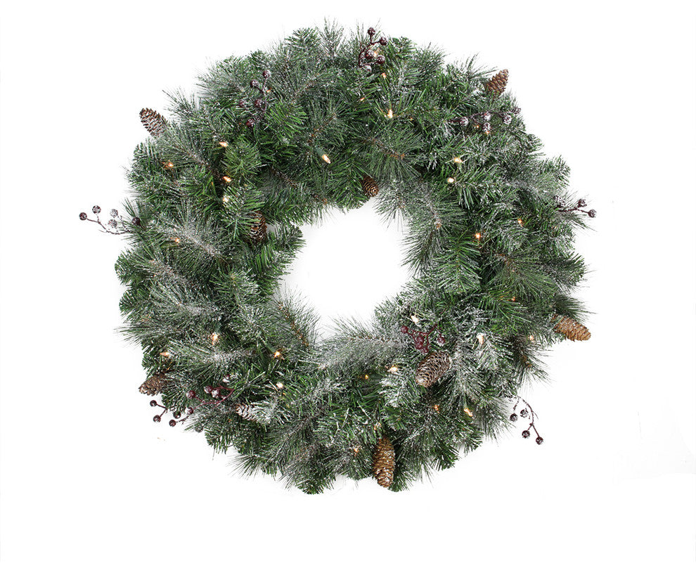 Features a mixture of traditional two-tone PVC tips and long needle pine accented with red berries pine cones and lightly frosted tips dusted with sparkling glitter | Product Features: | Pre-lit with 50 clear lights | Bulb size: mini | 150 tips | 2"-3.5" wide tips | 30" green lead cord | Flame retardant | Additional Product Features: | Light sets on wreath are UL listed for indoor or outdoor use however the wreath itself is recommended for indoor use | If one bulb burns out the rest will stay lit | Lights are equipped with Lamp Lock feature which makes them replaceable interchangeable and keeps them from falling out | Contains 1 plug with end connector which allows you to stack multiple lighted items together (not to exceed 210 watts) | No assembly required - wreath comes in 1 piece | Includes a heavy duty ring metal frame backing with hook for hanging | Comes with replacement bulbs and spare fuses | Wire gauge: 22 | 120 volts 60 hertz .17 amps 20.4 watts | Dimensions: 30" diameter (measured from outermost tip to outermost tip across the wreath) | Material(s): PVC/metal/glass bulbs/wire