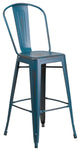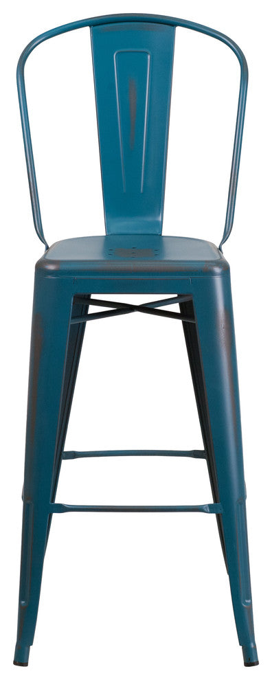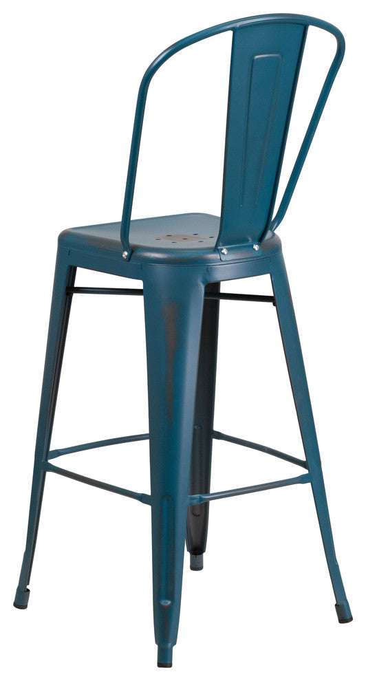 30" High Distressed Kelly Blue-Teal Metal Indoor-Outdoor Barstool With Back