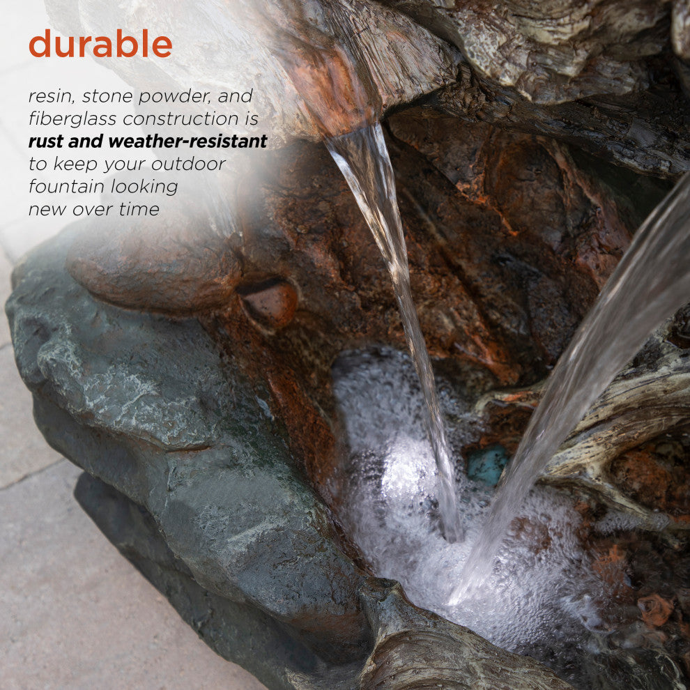 Relax and enjoy the sounds of nature with the Alpine Corporation 3-Tier Rainforest Cascading Waterfall Fountain! This outdoor fountain looks great in your garden, patio, deck, porch, or yard space. The front of the trunk opens up to reveal a gentle cascade of water that emits a calming, relaxing sound you''ll love at the end of the day. Completely natural in appearance, the fountain is actually crafted of durable, weather-resistant resin, stone powder, and fiberglass. LED lights in each of the 3 tiers illuminate your space, drawing attention to the relaxing water pools day or night for added ambiance. To use, simply plug into an outdoor outlet, fill lower level with water, and watch as the interior pump creates a lovely water flow reminiscent of a lush rainforest. With a 1-year warranty, you can be confident in the quality of your purchase. Fountain measures 40"L x 23"W x 30"H for use in yards of any size. WATERFALL FOUNTAIN: Garden water fountain with LED lights is the perfect addition to your outdoor decor. Interior pump keeps the water flowing - just plug it in! RELAXING WATER FLOW: Water trickles from each tier to mimic the sounds of a real waterfall, adding peaceful ambiance to your outdoor setting NATURAL LOOK: Realistic tree trunk wood look brings a touch of natural beauty to your space DURABLE: resin, stone powder, and fiberglass construction is rust and weather-resistant to keep your outdoor fountain looking new over time IDEAL SIZE: Water fountain measures 40"L x 23"W x 30"H, the perfect size for your yard, and includes a one-year manufacturer''s warranty from date of purchase