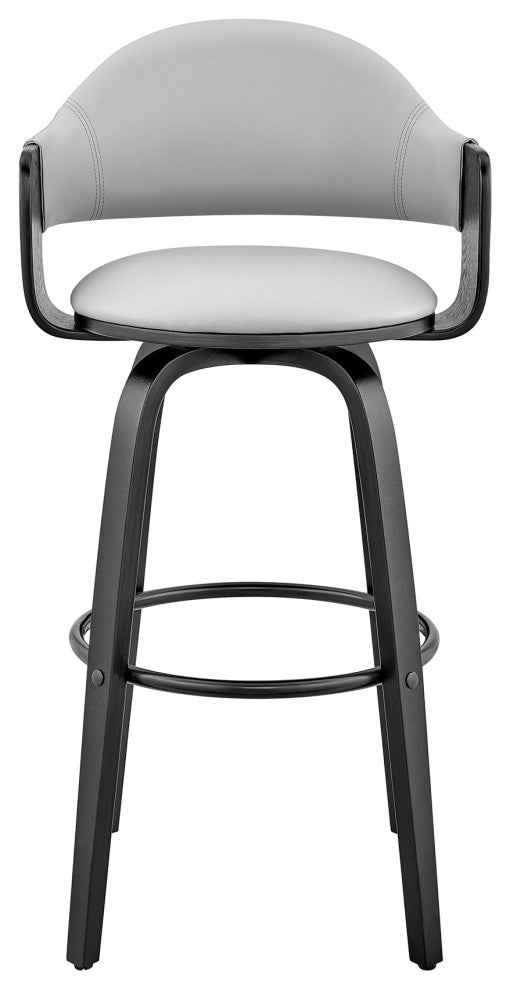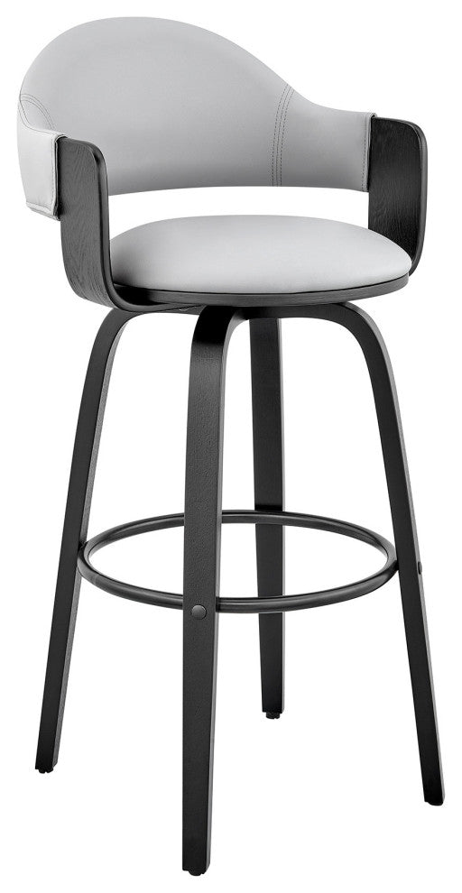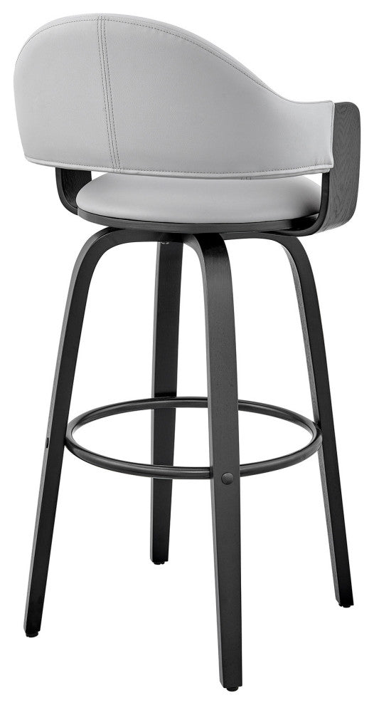 Set up your home with some next-level stylish design with this 30" Rich Grey Faux Leather Bar Stool with Black Wood. The stool live up to its name as it is adorned in rich faux leather that is perfectly contrasted by its black wood frame that runs down to the base to provide a very strong support for the entire stool structure so you can conveniently sit knowing that the stool can and will hold your weight. The seat is cushioned and well padded with high-density foam that provides enough comfort. The metal footrest sits perfectly between the wooden legs and that only shows how the different elements featured in this chair combine well to make it a masterpiece. Its 360-degrees swivel function can make you turn to any direction with ease. 40" x 20" x 20".
