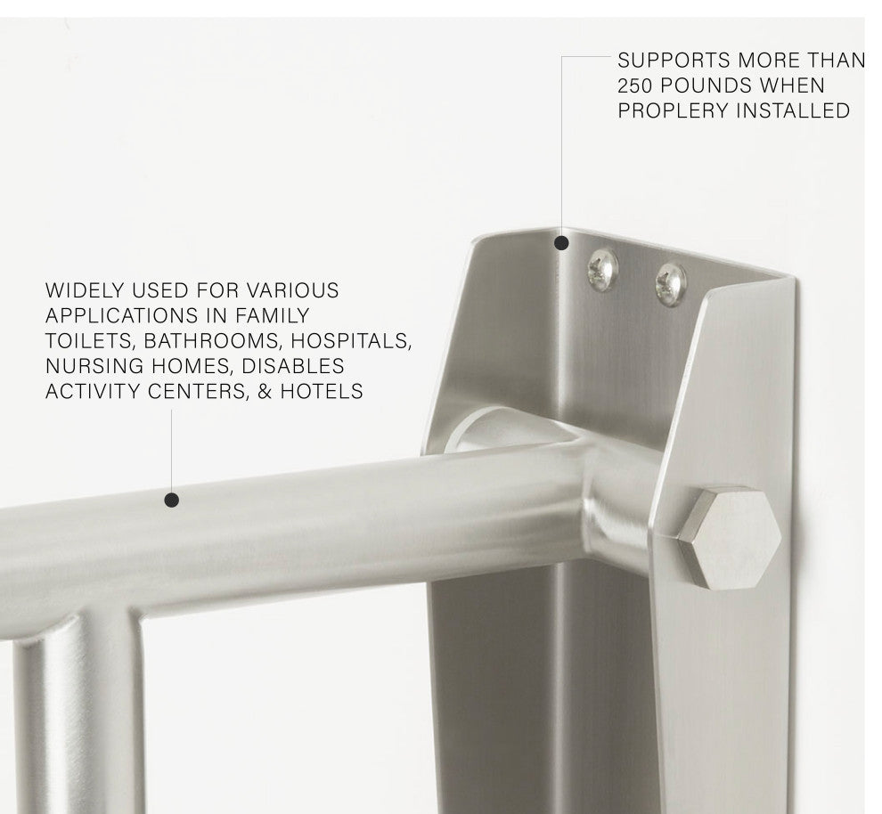 Used in a wide variety of applications for accessibility and support in restrooms, this safety grab bar enables the user to raise and lower themselves from a sitting position when the grab bar is in the down position and swings up for entry ease. This swing-up grab bar can be easily guided upwards to create space with less than three pounds of pressure and down again for secure support. Made from durable #304 stainless steel, this grab bar can support more than 250 lbs. when properly installed. The swing-up bar is 30" overall, has 1-1/4" diameter oval tubing, 12.38" stainless steel mounting plate, 1-1/2" wall clearance, includes mounting hardware, and a polished stainless or satin finish. This grab bar is designed in compliance with ADA Guidelines, satisfy Federal Specification WW-P-541/8b, certified for both commercial and residential use, and proudly made in the USA with 100% recyclable materials and support LEED compliance.