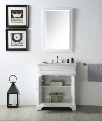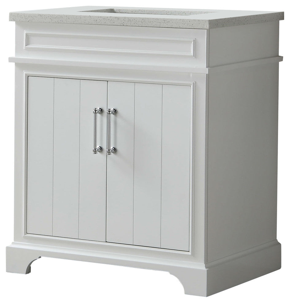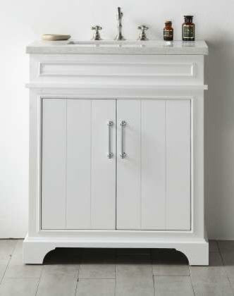 30" Wood Sink Vanity With Quartz Top-No Faucet . Legion Furniture 30" Wood Sink Vanity With Quartz Top-No Faucet . Included: Cabinet, Top, Sink . Cabinet Material: Solid wood +MDF . Dimensions : 30 X 22 X 35 . Top: 3cm thick quartz top . Sink :Rectangle Ceramic sink . Assembly :No Assembly required . Not included :Faucet . Faucet hole pre-drilled: 3 pre-drilled Faucet hole, 8" spread