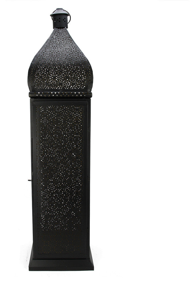 Moroccan style candle lantern features decorative cut-out designs | Uniquely finished with a matte black on the outside and a contrasting rich gold on the inside | Holds (1) pillar candle - not included | Can be carried | hung from a ceiling or used on a sturdy table top | Recommended for indoor use - if using outdoors place under a covered area | Dimensions: 33.25"H x 8.25"W x 8.25"D | Material(s): iron