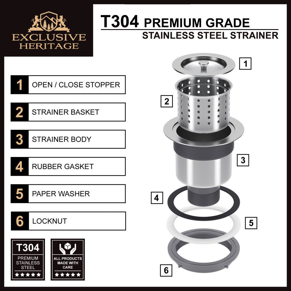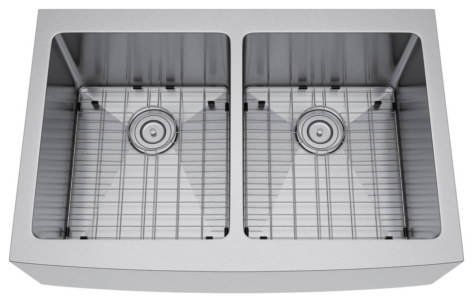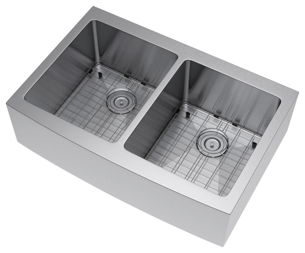 Add a little luxury to your kitchen with the help of Exclusive Heritage. No detail was overlooked when designing the 33 inch stainless steel farmhouse sink. The thick 16 gauge T-304 surgical-grade stainless steel is extremely durable, the rounded corners are easy to clean and sanitize, and the farmhouse design adds a contemporary element to any room. The 50/50 double basin provides one basin for pots and pans and a second basin for food prep and dish drying to simplify cleaning up. Exclusive Heritage offers strikingly modern designs for a clean kitchen. Experience the difference.FEATURES:• Premium grade T-304 stainless steel• Durable 16 gauge thickness with commercial grade finish• 18% Chromium 10% Nickel composition for superior corrosion resistance and a beautiful sink luster• Scratch and stain resistant premium polished satin finish• State of the art sound dampening pads and undercoating• Stylish channel grooves engineered for easy drainage• Dynamic round radius corners for easy cleaning• Iconic farmhouse design• Extra deep sink bowl design• Certified and listed by cUPC, SCC, IAPMO and ANSI• Bottom grid included• 3.5" Strainer included• Mounting hardware included• Cutting template included• Limited lifetime warrantySPECIFICATIONS:• Number of Basins: Double Basin• Total Outer Sink Dimensions: 32.875"x22"x10"• Total Inner Left Bowl Dimensions: 14.50"x17.25"x9"• Total Inner Right Bowl Dimensions: 14.50"x17.25"x9"• Product Weight: 46.39 lbs• Material: Stainless Steel• Sink Gauge: 16• Installation Type: Farmhouse