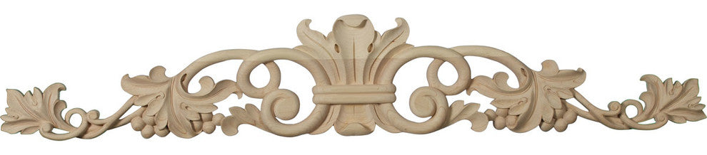 36"W x 6 1/4"H x 1"D Large Marseille Center with Scrolls, Alder. Our appliques and onlays are the perfect accent pieces to cabinetry, furniture, fireplace mantels, ceilings, and more. Each pattern is carefully crafted after traditional and historical designs. Each polyurethane piece is easily installed, just like wood pieces, with simple glues and finish nails. Another benefit of polyurethane is it will not rot or crack, and is impervious to insect manifestations. It comes to you factory primed and ready for your paint, faux finish, gel stain, marbleizing and more.