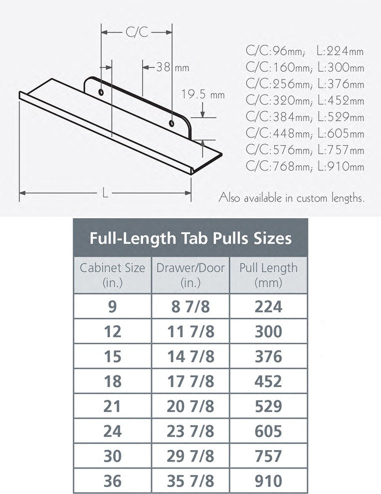 The Schwinn Full-Length Tab Pull Series is designed to run the full length of a cabinet drawer or door for a clean, linear modern look.