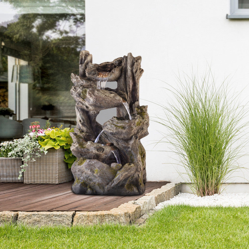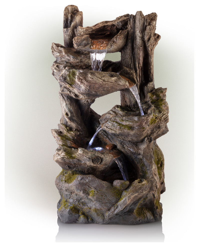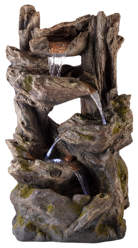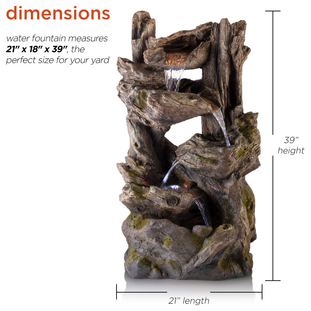 Relax and enjoy the sounds of nature with the Alpine Corporation 4-Tier Rock Fountain! With this high-quality fountain, you can create a meditative, relaxing atmosphere, even in an urban jungle. The waterfall looks great in your garden, patio, deck, porch, or yard space. Take in the tranquil sounds of the water gently cascading over natural-looking aged wood. The resin, stone powder, and fiberglass construction is weatherproof, rust-resistant, and durable for years of quality use. To use, simply plug into an outdoor outlet, fill lower level with water, and watch as the interior pump creates a lovely water flow reminiscent of a lush rainforest. LED lights in each of the 4 tiers illuminate your space, drawing attention to the relaxing water pools day or night for added ambiance. With a 1-year warranty, you can be confident in the quality of your purchase. Fountain measures 21"L x 18"W x 39"H for use in yards of any size.WATERFALL FOUNTAIN: garden water Fountain is the perfect addition to your Outdoor decor. Interior pump keeps the water flowing - just plug it in! RELAXING WATER FLOW: water trickles from each tier to mimic the sounds of a real waterfall, adding peaceful ambiance to your Outdoor setting NATURAL LOOK: realistic aged wood logs brings a touch of natural beauty to your space DURABLE: resin, stone powder, and fiberglass construction is rust and weather-resistant to keep your outdoor fountain looking new over time IDEAL SIZE: Water fountain measures 21"L x 18"W x 39"H, the perfect size for your yard, and includes a one-year manufacturer''s warranty from date of purchase