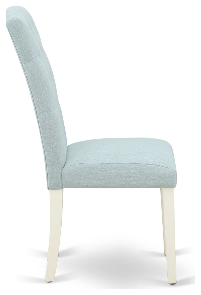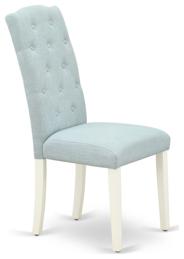 • Our dining room chairs consist of a comfortable baby blue linen fabric seat and Linen White finish frame. This dining room table has a Linen White top and Linen White legs. We have colored this modern dining table set with rich color that creates the best high-quality color collaboration to provide a quality look to your living area.