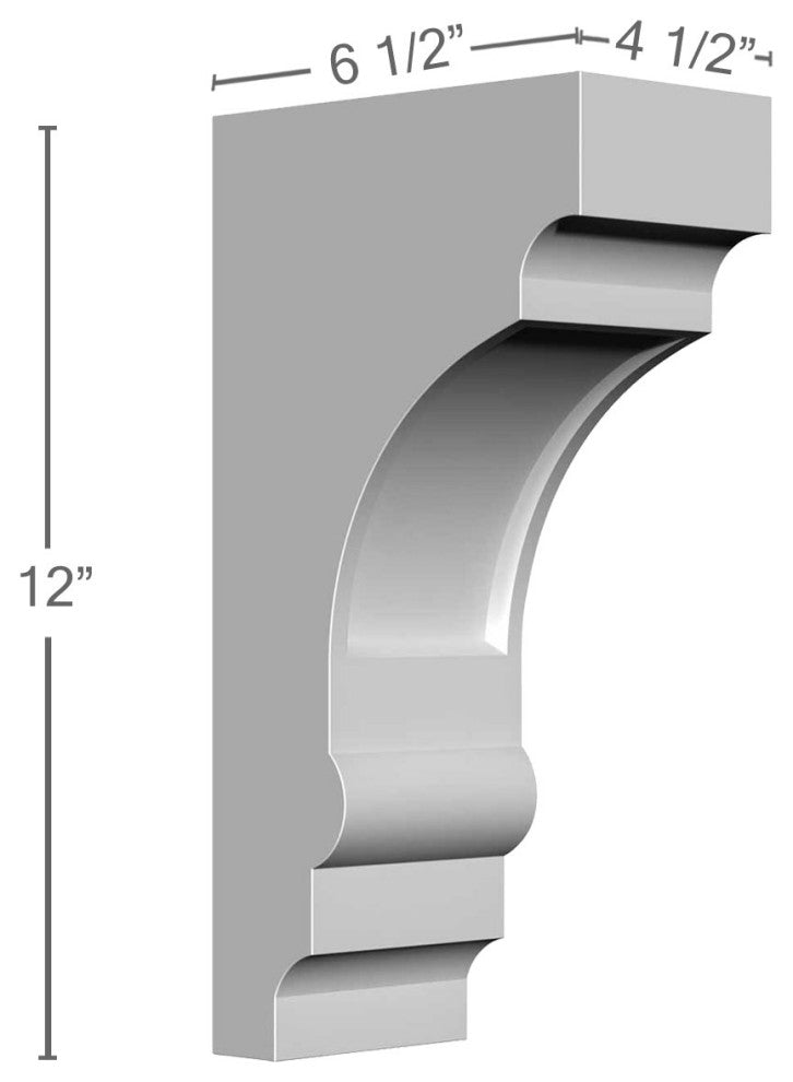 4 1/2"W x 6 1/2"D x 12"H Diane Bracket. These brackets are truly unique in design and function. Primarily used in decorative applications urethane brackets can make a dramatic difference in kitchens, bathrooms, entryways, fireplace surrounds, and more. This material is also perfect for exterior applications. It will not rot or crack, and is impervious to insect manifestations. It comes to you factory primed and ready for your paint, faux finish, gel stain, marbleizing and more. With these corbels, you are only limited by your imagination.