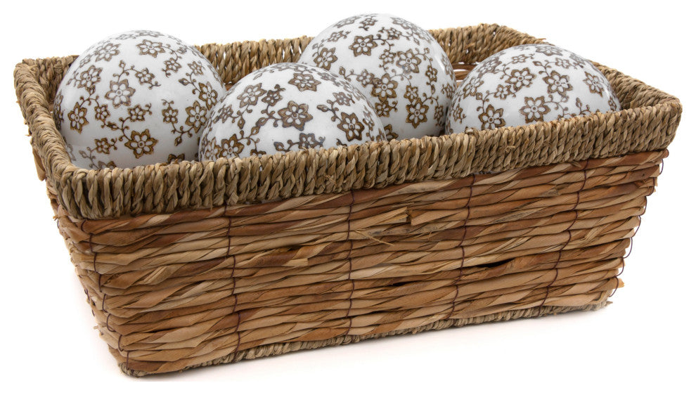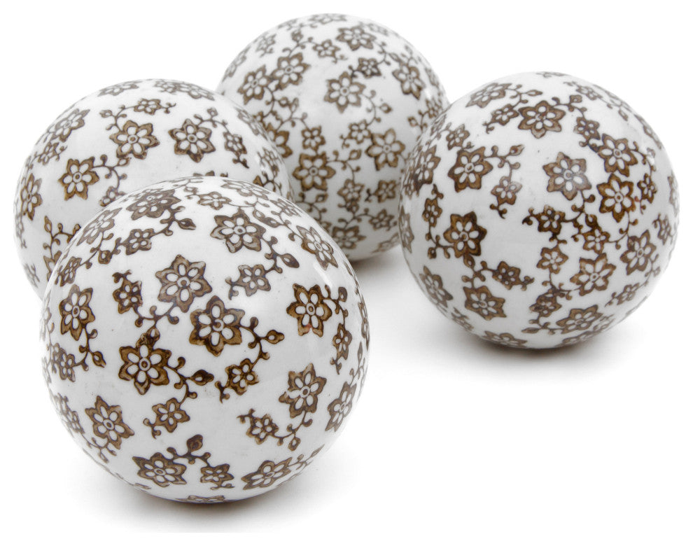 Beautiful star-shaped flowers decorate the sides of these charming porcelain balls. This set of four balls features a lovely dark gold on white design that will look stunning on a shelf or mantel, or arranged in a basket or bowl as a creative centerpiece.Delicate Floral Pattern: Decorated with beautiful brown gold flowers on white porcelain. Embrace the refined charm of this elegant motif to add a touch of sophistication and allure to your decor.Set of 4 Decorative Porcelain Balls: Elevate your home decor with this stunning collection of 4" porcelain orbs. Use them together or spread the spheres around for an exquisite decorative accent in any room. An easy way to redecorate seasonally.Traditional Craftsmanship: This was made by hand in a small workshop by a traditional artisan employing centuries of knowledge and cultural heritage. Each piece is a unique work of art and may vary slightly in exact design and detail.Modern High-Temperature Firing: This exceptional ceramic boasts a vitreous porcelain finish achieved through firing in a state-of-the-art high-temperature kiln. Its strength and durability ensure a top-quality, reliable product for all your needs.Classic Design for Today''s World: By supporting traditional artisans in a changing world you help keep their crafts alive and available. These vanishing arts are precious and make a beautiful gift for a birthday, anniversary, housewarming, or holiday.