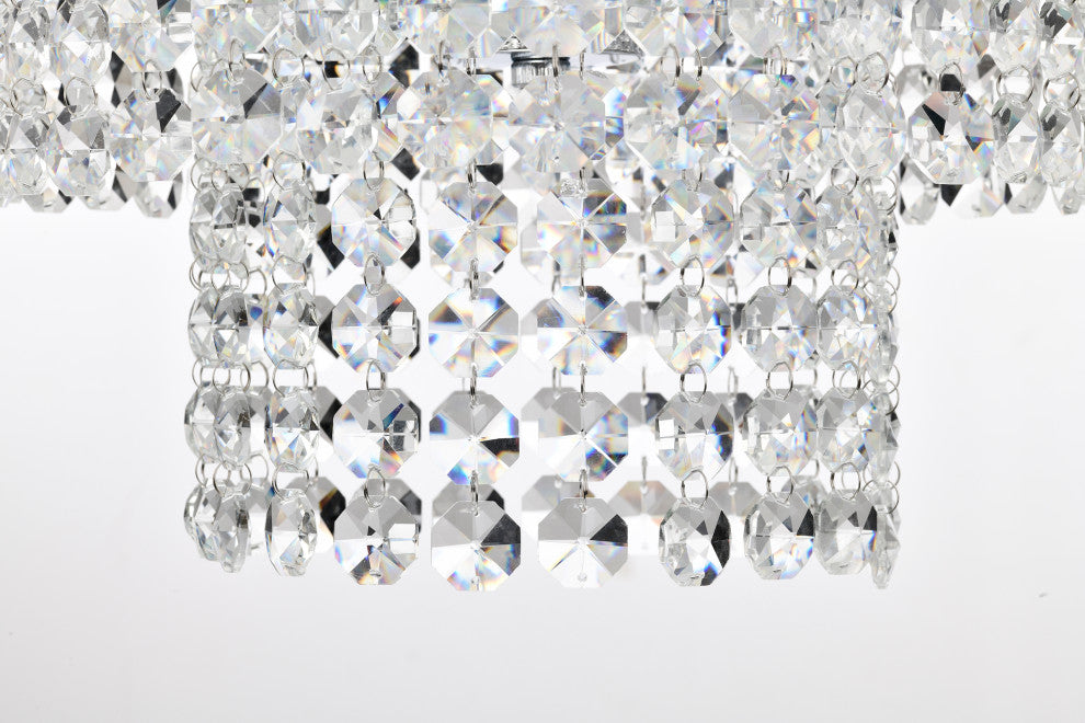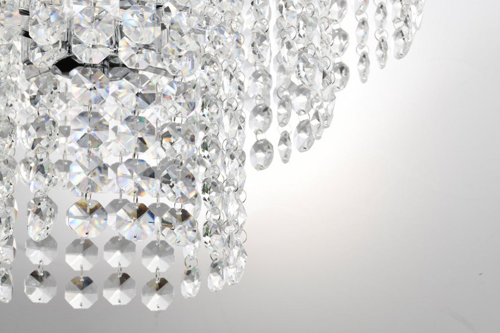 Send sparkles all throughout your home with this stunning 4 light tiered crystal chandelier. The unique silhouette of this chandelier features a nest of rings that form tiers of cascading crystal strands. Beneath the gorgeous array of reflective crystals are four E12 candelabra bulbs (not included) that emit a soft, ambient glow. Place this modern chandelier in the entryway to grab the attention of your guests, or above the dining room to illuminate special gathering moments. For ease of installation, this chandelier comes with a 40 inch adjustable chain that may be shortened to suit a variety of different ceiling heights and room sizes. We recommend adding a dimmer switch to set the mood accordingly.