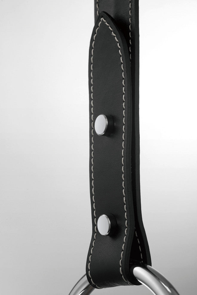 Flat chrome disk with metal loop is suspended by faux leather. A remarkable arrangement that''s sure to standout. This unique composition inspired stirrups add a quirky element your decor.