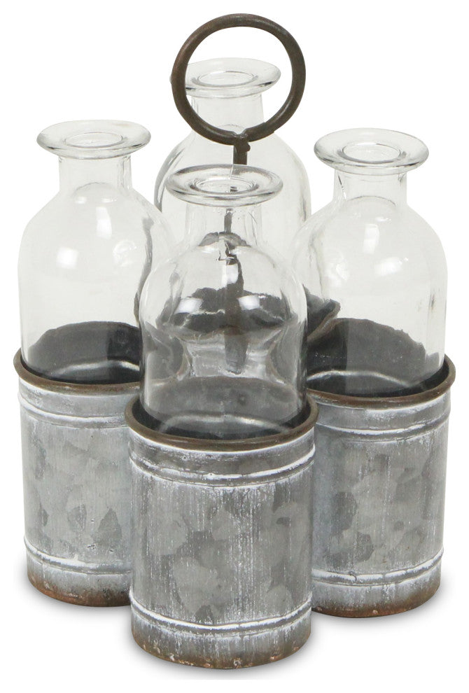 Well suited to both industrial, coastal and traditional themes, glass jars and their complementing accents can enhance any space. This piece features a galvanized metal, 4 slot caddy with a center handle and 4 glass jars. From decorative to functional and nautical to farmhouse, glass jars will be a dependable and eye catching addition to your home.