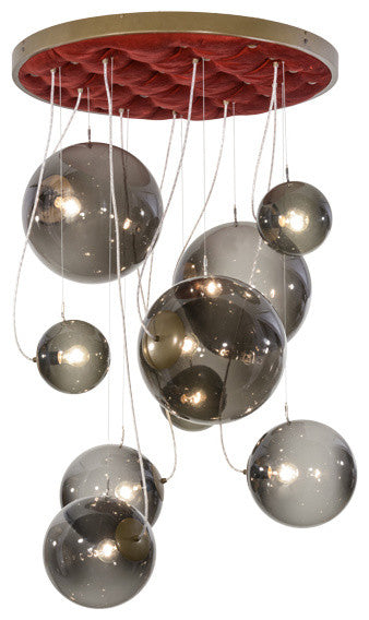Bold, eye-catching appeal integrates retro modernism with luxurious elegance This innovative pendant features an array of sphere-shaped, Smoke acrylic diffusers that appear to be floating in air. The orbs are juxtaposed at various heights from a Crimson Tufted Velvet canopy, which is accented with Gold Fabric wrapped buttons. This fixture, which is handcrafted by Meyda artisans in the Yorkville, New York manufacturing facility, is ideal for restaurants, hotels, resorts, boutiques, lounges and luxury homes. Custom colors, styles and sizes are available, as well as dimmable, energy efficient lamping options.