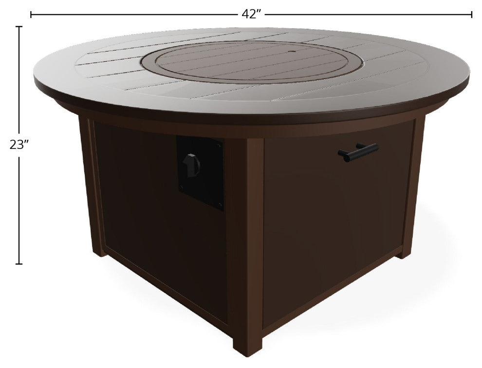 Cozy up your outdoor evenings with our line of thoughtfully crafted fire tables. Featuring durable aluminum frames and weather-resistant construction, they combine modern design with lasting performance. Pullout propane shelving offers easy fuel changes, while versatile options for natural gas or propane adapt to your needs. Whether warming chilly nights or creating a cozy centerpiece for conversations, these fire tables are designed to complement any outdoor space.Features:•  Overall product dimensions are 42" W x 42" D x 23" H•  Durable powder-coated aluminum frame with marine grade polymer panels and stainless steel fire bowl•  Convenient electronic ignition powered by natural gas or liquid propane•  Includes flush aluminum top cover for use as a coffee table•  Slat top design ensures durability, water drainage, and a sleek look•  Includes natural gas convertor kit and crystal clear fire gems at no additional charge•  Proudly made in the USA with over a century of craftsmanship since 1903Dimensions:Outdoor Fireplace•  Assembled Product: 42 inches wide x 42 inches deep x 23 inches high•  Weight Capacity: 350 pounds