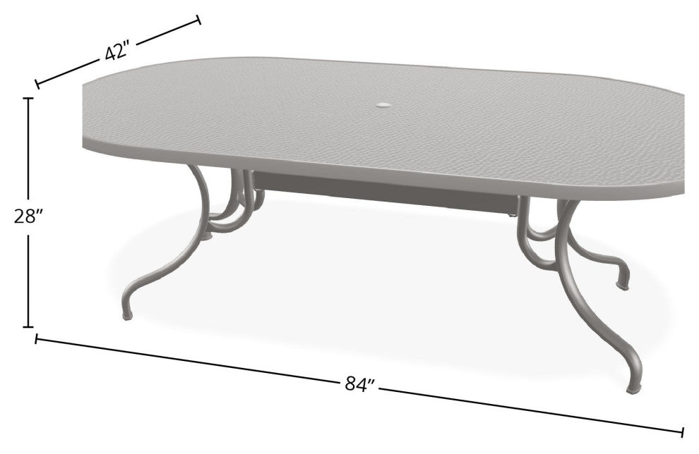 The Hammered Tabletop collection blends distinctive texture with lasting durability for any outdoor setting. Inspired by handcrafted metalwork, the table''s surface adds visual interest while complementing a range of styles. Built with marine-grade polymer, it''s designed to withstand the elements season after season. Thoughtfully designed with an integrated umbrella hole, these tables offer a seamless mix of practicality and style.Features:•  Overall product dimensions are 42" W x 84" D x 28" H•  Sturdy powder-coated aluminum legs designed for durable dining height support•  High-quality 100% stainless steel hardware•  Hammered table top design resists wear while adding texture•  Low-maintenance and easy to clean•  Available in multiple color variations•  Proudly made in the USA with over a century of craftsmanship since 1903Dimensions:Dining Table•  Assembled Product: 42 inches wide x 84 inches deep x 28 inches high•  Weight Capacity: 350 pounds
