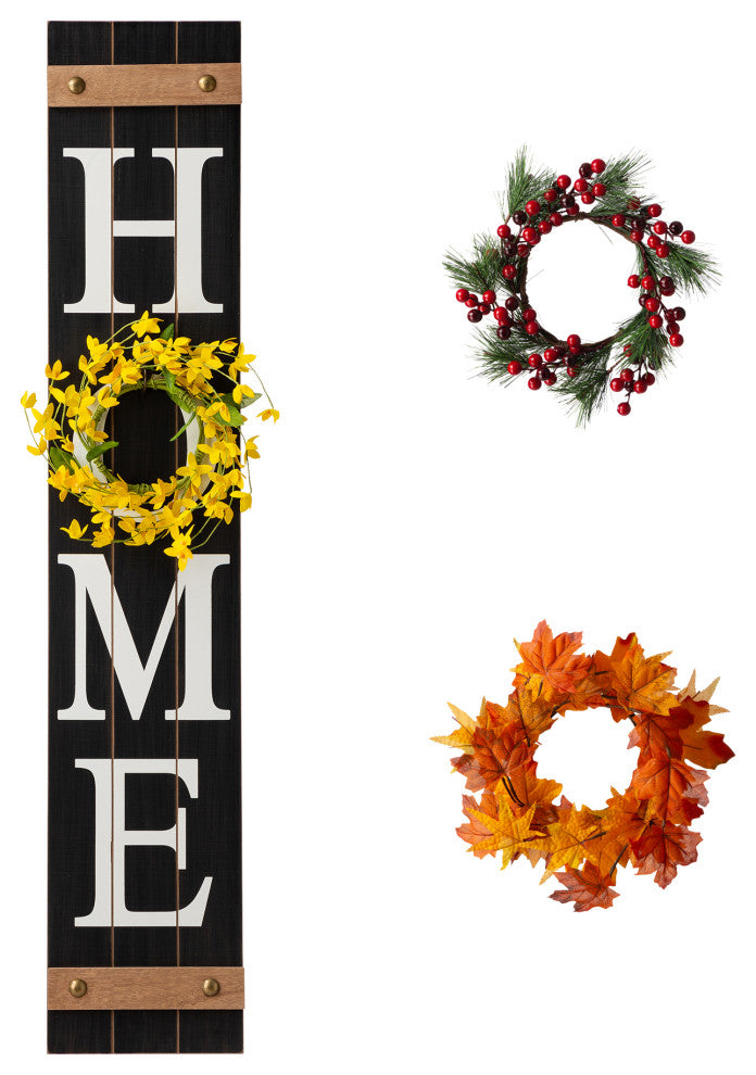 - Let''s investing your friends with this rustic welcome "HOME" floral porch sign.- Crafted with premium wooden board with "HOME" and two natural slat decorated.- Eye catching changeable three floral wreathes included. It will accompany you with full season of Fall Harvest ,Christmas and Spring.- Package includes: 1 Home porch sign, 3 floral wreaths of winter jasmine, maple leaves, berry needles.