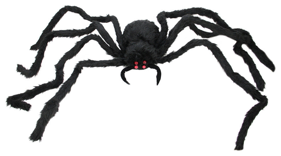 Create a "spooktacular" display this Halloween with this dreadfully frightening spider | Spider is soft and fuzzy with (8) poseable long legs and flashing red eyes for a creepy effect | Requires (2) "AA" size batteries - not included | Convenient on/off switch on base | Recommended for indoor use - if using outdoors place under a covered area | Dimensions: 27"H x 44"W x 19"D | Material(s): foam/plastic/faux fur