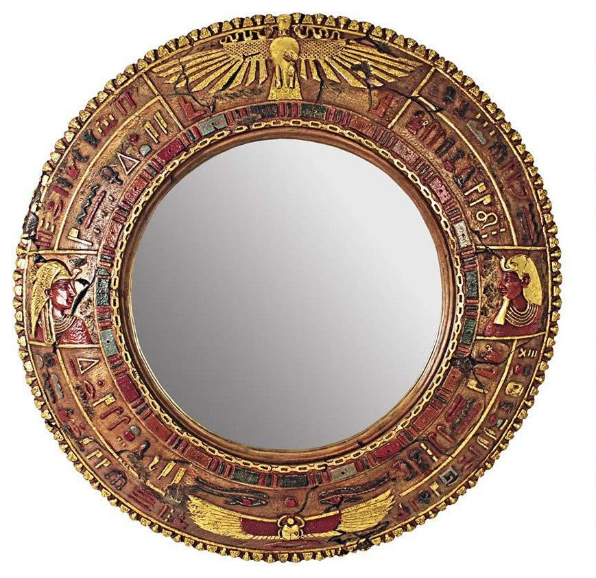 This nearly four-foot-diameter mirror sculpture will impress guests with its massive scale, which is based on great Egyptian architecture. Ringed with hieroglyphs and images of ancient Egypt, it is expertly hand-painted. Mirrors were highly prized by Egyptians and only wealthy, upper-class members of their society had access to such luxury items. This large-scale, display-quality indoor wall sculpture transforms any home bar, entertainment area or recreation room into something truly magnificent!44.5"dia. x 5"D. 44 lbs.
