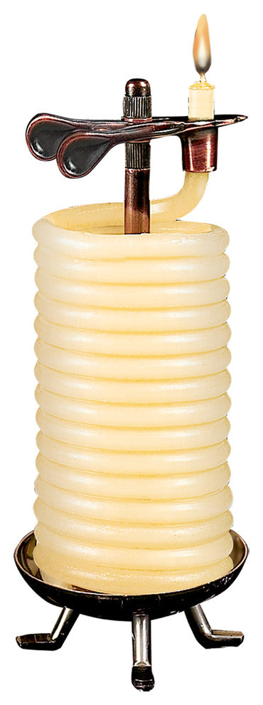 With hours of dreamy candlelight in your Candle by the Hour, you can set the amount of time it burns, hour by glowing hour. Simply feed the pliable bees wax coil through the candle clip in increments of 3 inches or less. Three inches of candle will for approximately 1hour. Set your nights alight with the Candle By The Hour. Burning time is 80 hours. Features and details: Quirky bees wax candle coil is sculptural like. Candle reaches upwards in a spiral from a metal burning plate with metal calipers griping the candle Unique conversation piece for the living room. Burns as long as you tell it to, then extinguishes itself. Candle size - 5" Diam x 10.55"H. Made in Vietnam.