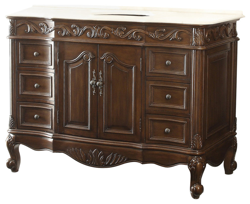 • Please Note• Faucet not includedThe digital images on our website are as accurate as possible. However, different monitors may cause colors to vary slightly.Model sw-3882w-tk-48dimensions: 48 x 22 x 35"Hfeaturing a larger storage area, the traditional beckham bathroom sink vanity is a perfect fit for those searching for a sophisticated and practical addition to their bathroom d��cor. This vanity includes fully-functional drawers and two central doors that open to reveal ample storage space and easy plumbing access. The white marble counter top accompanies the lush finish of the cabinet body, complimenting the carved accents. Imagine the total transformation of your bathroom d��cor with the addition of the space-enhancing and practical beckham bathroom sink vanity.the marble counter top is made of the highest quality to be durable and long-lasting, and to resist the effects of prolonged exposure to humid conditions.fully assembled by manufacturer, sink and counter top pre-installedwhite marble counter top (one large genuine piece)white under mount porcelain sink6 functional side drawers are with full extension metal slidesmaterials: solid wood structure & carb ph2 certified panelscabinet style: classic, color: dark brownlarge storage compartment, back panel pre-cut opening for easy plumbing access1" (h) back splash included in the counter topfaucet, 3 holes - 8" wide spreaddue to the nature of natural stones, it''s normal for stone counter tops and sinks to have variation in color and texture, discolored spots, pores, veins or other birthmarks and imperfections. Therefore, these are not considered defective. To avoid any dirt or stain from getting into the stone, we highly recommend you to seal any stone surfaces before installation. the digital images on our website are as accurate as possible. However, different monitors may cause colors to vary slightly. brand: benton collectionmirror included (no)countertop included (yes)basin included (yes)faucet included (no)hardware included (yes)backsplash included (yes)