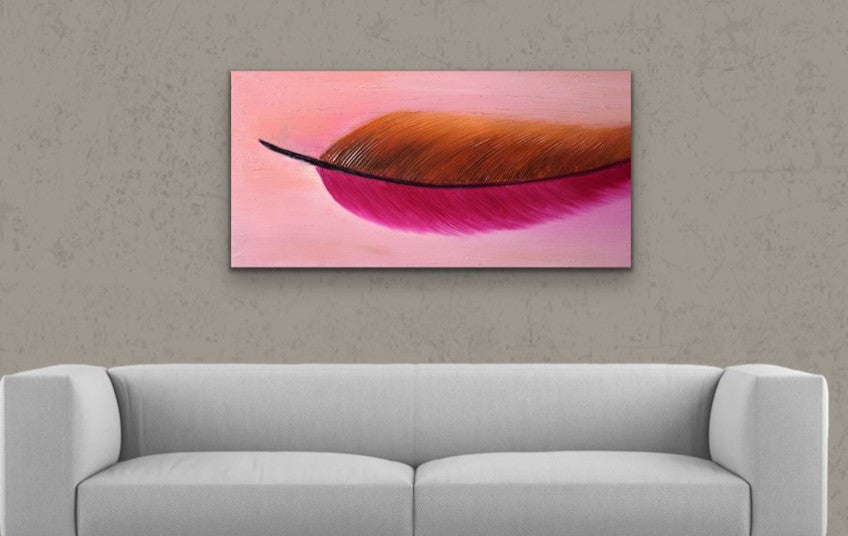 Title: Blushing PhaseSize: 48" x 24" x 1.5" deep gallery profile, back wrapped stretched canvas, painted edges - ready to hang with preinstalled wiresMedium: AcrylicDominant Colors: Pink, magenta, brownQuality: Signed and dated on the front and back by the artist. A clear, gloss coating has been applied to the surface to protect the painting from UV light, moisture, and dust.This artwork has been created with a palette knife and brush strokes in my style.Used professional artist grade canvas.Shipping: All of my paintings are packed with special care.Note: Outer frames not included, contact us for framing options (additional cost)