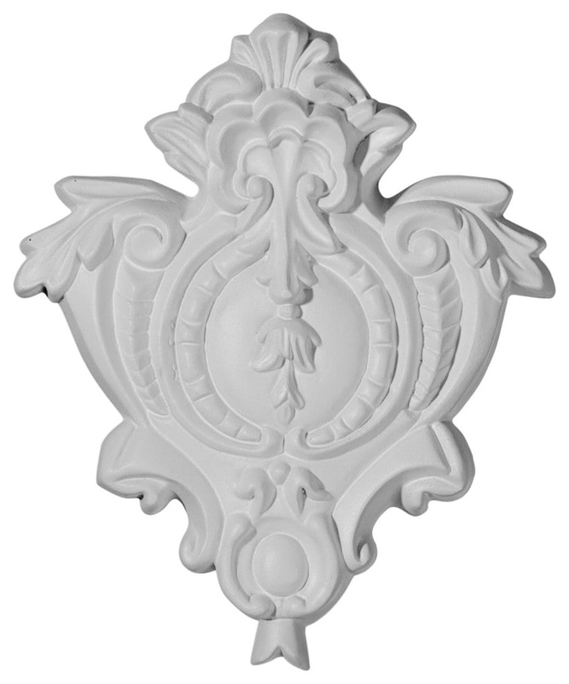 5 1/2"W x 6 3/4"H Hillsborough Center Onlay. Our appliques and onlays are the perfect accent pieces to cabinetry, furniture, fireplace mantels, ceilings, and more. Each pattern is carefully crafted after traditional and historical designs. Each polyurethane piece is easily installed, just like wood pieces, with simple glues and finish nails. Another benefit of polyurethane is it will not rot or crack, and is impervious to insect manifestations. It comes to you factory primed and ready for your paint, faux finish, gel stain, marbleizing and more.