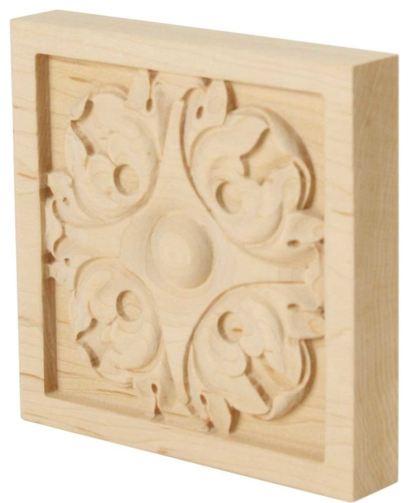 5 1/8"W x 5 1/8"H x 7/8"D Large Leaf Rosette, Cherry. Our rosettes are the perfect accent pieces to cabinetry, furniture, fireplace mantels, ceilings, and more. Each pattern is carefully crafted after traditional and historical designs. Each piece comes factory primed and ready for your paint. They can install simply with traditional adhesives and finishing nails.