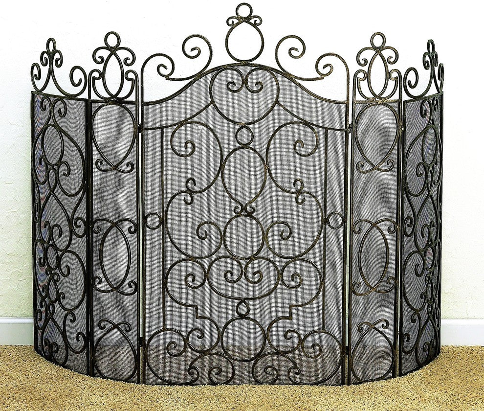 With roots in traditional design, the 5-Panel Fire Screen showcases beautiful, intricate curved metal detailing on its face. Made with iron, this fire screen replicates the look of antique brass. Stylish and functional, the 5-Panel Fire Screen features mesh backing that protects your home from popping embers from the crackling fire.