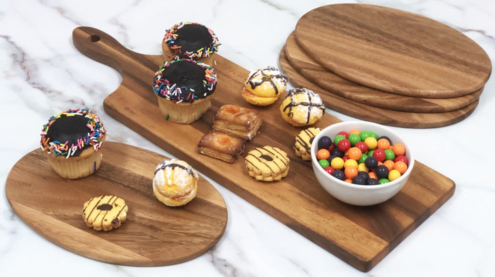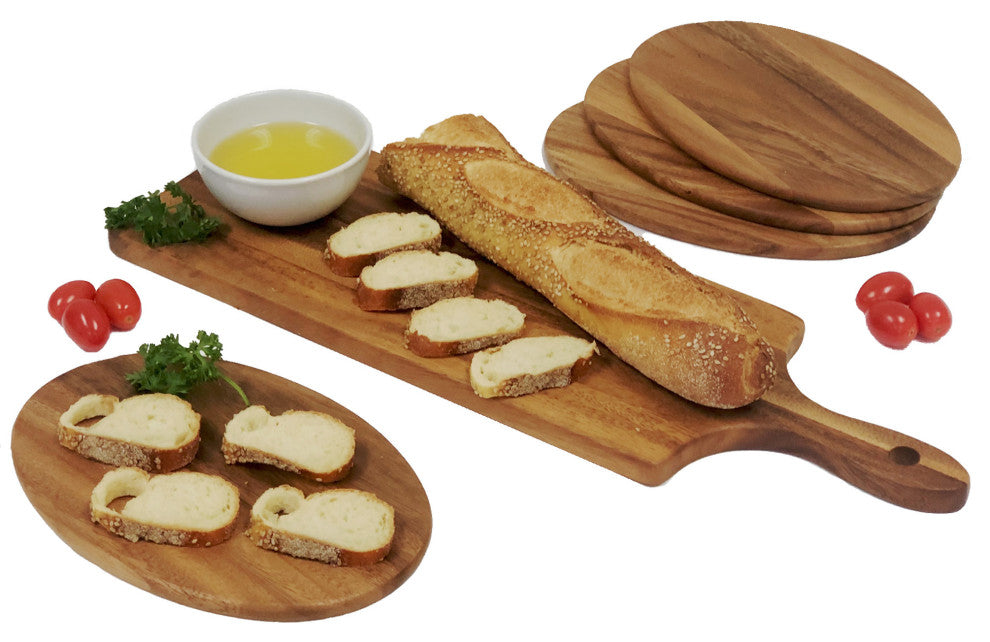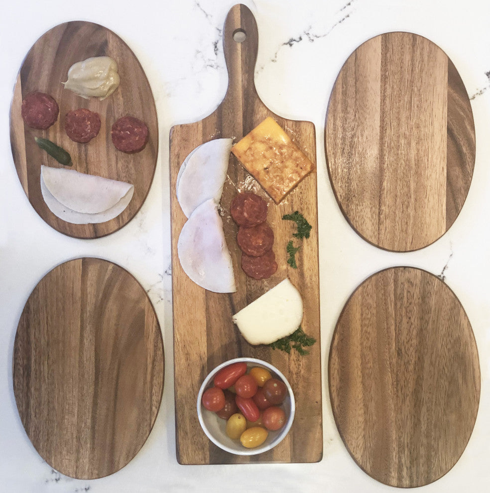 The 5 Piece serving tray set is perfect for an occasion, party, or everyday use. It is great for serving bread, charcuterie, sushi, desert and more. Hand wash to clean. Made in Thailand.Serving Tray: 19.5" x 6" x .5"Individual Oval Tray: 9.5" x 6" x .25"