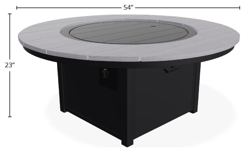 Cozy up your outdoor evenings with our line of thoughtfully crafted fire tables. Featuring durable aluminum frames and weather-resistant construction, they combine modern design with lasting performance. Pullout propane shelving offers easy fuel changes, while versatile options for natural gas or propane adapt to your needs. Whether warming chilly nights or creating a cozy centerpiece for conversations, these fire tables are designed to complement any outdoor space.Features:•  Overall product dimensions are 54" W x 54" D x 23" H•  Convenient electronic ignition powered by natural gas or liquid propane•  Includes aluminum top cover for use as a coffee table•  Rustic polymer table top features a stylish, textured design•  Lift kits are available to raise the fire table to dining, balcony, and bar height•  Includes natural gas convertor kit and crystal clear fire gems at no additional charge•  Proudly made in the USA with over a century of craftsmanship since 1903Dimensions:Outdoor Fireplace•  Assembled Product: 54 inches wide x 54 inches deep x 23 inches high•  Weight Capacity: 350 pounds