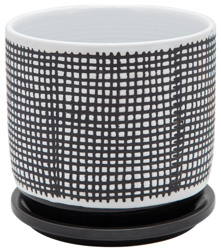 6" Mesh Gray design ceramic planter with saucer. The stark ceramic planter bowl provides the versatility, while the design adds a touch of formal style to help them compliment a wide variety of indoor and outdoor decors. Comes with draining holes and attached water-catching saucers.