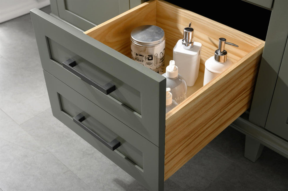Dimensions: L:22 x W:60 x H:34Finish: PEWTER GREENCounter Top: Black StoneSink: White Ceramic SinkFaucet: Not IncludedFaucet hole : 4" Pre-drilled 3 holesMatching Mirror: Sell SeparatelyMirror Dimensions: L:1 x W:24 x H:36Wood Material: MDF/VeneerWater Sealer: Water Resistant Low SealerHardware: Black1-year parts-only warranty on manufacturer defects