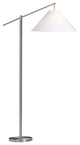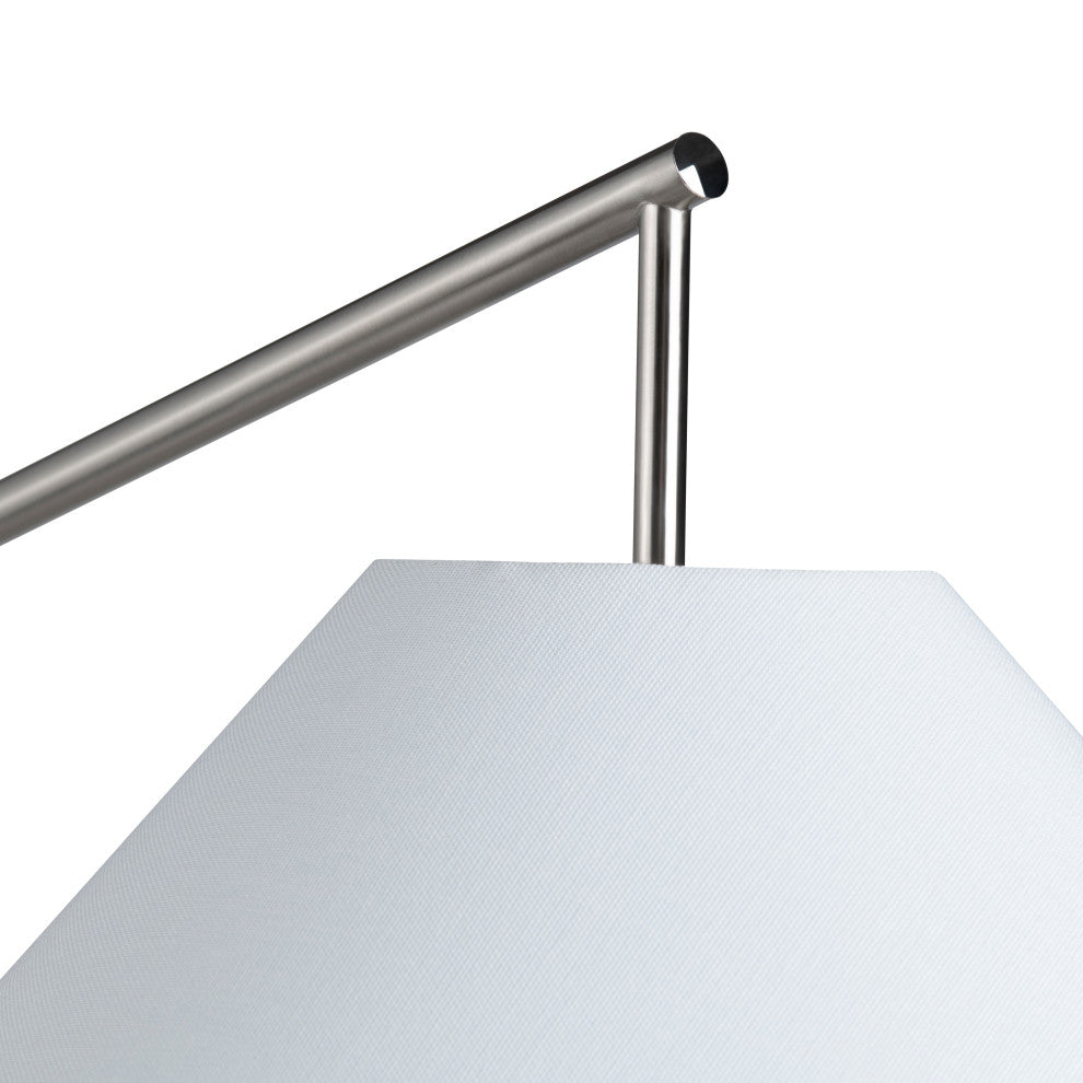 This sleek floor lamp seamlessly blends modern style with functionality. Crafted from durable steel with a brushed silver finish, its minimalist design features a sturdy round base and an extended horizontal arm for an architectural touch. The crisp white tapered drum shade, made from linen with a hardback construction and secured by a threaded uno fitter, softly diffuses light, adding elegance to any room. Conveniently equipped with an in-line on/off switch on the 6-foot clear cord, this lamp accommodates a 100W bulb (not included), making it perfect for task or ambient lighting. Its clean lines and timeless design enhance any space with contemporary sophistication