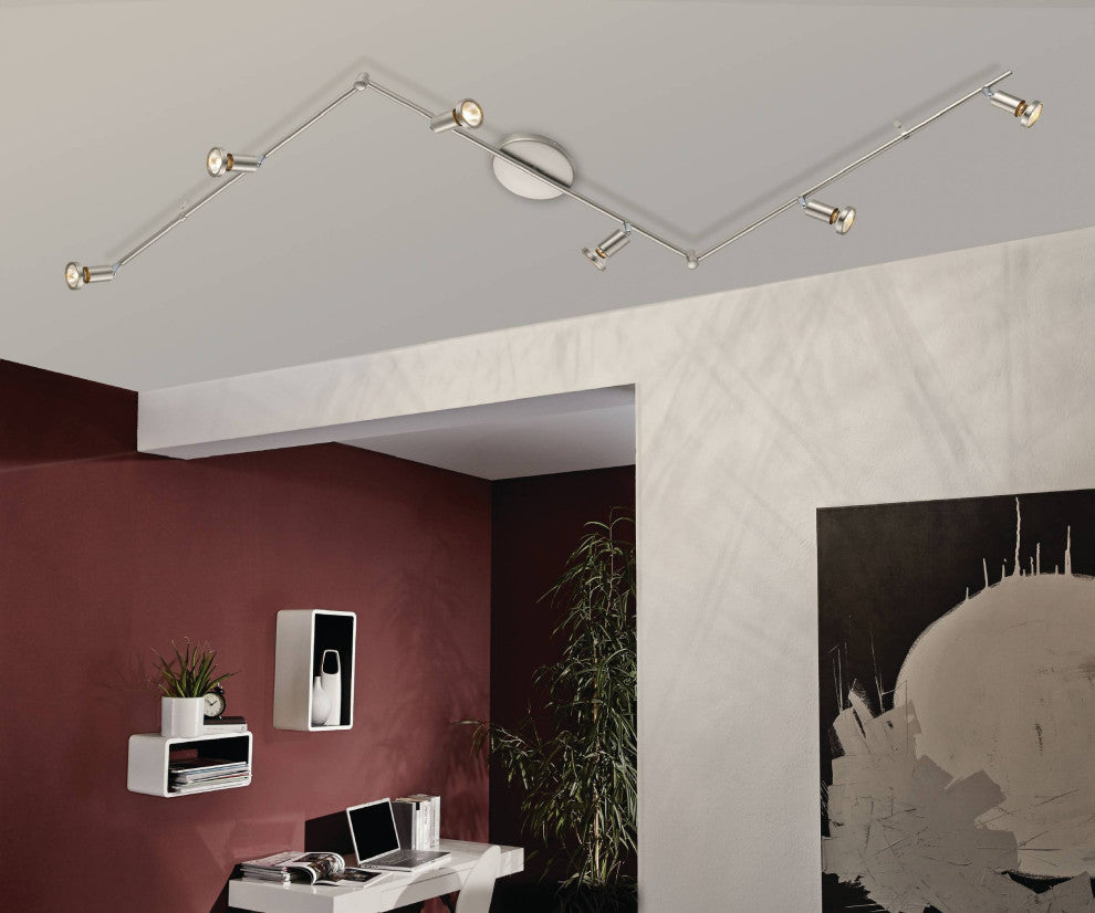 The Eglo Buzz 2, 6 light track light, uses simple, stylish design to function as sharp contemporary or transitional fixture. With adjustable halogen lights and adjustable track and clean matte nickel finish, this fixture will accent your modern decor. These multifunctional lights work great as directional accent lighting and task lighting.Track lightFull Track Lighting KitProduct Dimensions: 74 3/8"L x 4 1/2"W x 4 3/8"HBackplate Measurements: 5 1/2" W x 4 1/4" HNumber of Bulbs Required: 6 Bulb(s)Bulb included: NoType of Bulb: GU10Wattage: 300W (6x50W)Voltage: 120VBulb Shape: GU10Bulb Base: GU10Material Fixture Made of IronBase Material: IronFixture Finish: Matte NickelSwarovski Crystal: NoIs Mounting Hardware Included: YesAssembly Required: YesScratch Resistant: NoRust Resistant: NoHardwiredSloped Ceiling Adaptable: NoMulticolor-Changing LED: N/AAdjustable Lamp Heads, Adjustable Track, LED CompatibleUL WET/DAMP LOCATION: DryLighting Type: ETLRoom Use: IndoorsWarranty: 1 Year