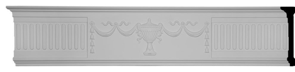 7 1/2"H x 1 3/4"P x 96"L Federal Urn & Ribbon Chair Rail. Beautiful crown moulding is a great way to separate and define each room. With each design modeled after traditional plaster type mouldings, our lightweight polyurethane mouldings give the same rich detail, yet at a fraction of the cost. Most moulding profiles can be partnered with our do-it-yourself corner blocks that means no miter cutting for you and most rooms can be completed in ours instead of days. Another benefit of polyurethane is it will not rot or crack and is impervious to insect manifestations. It comes to you factory primed and ready for your paint, faux finish, gel stain, marbleizing and more.