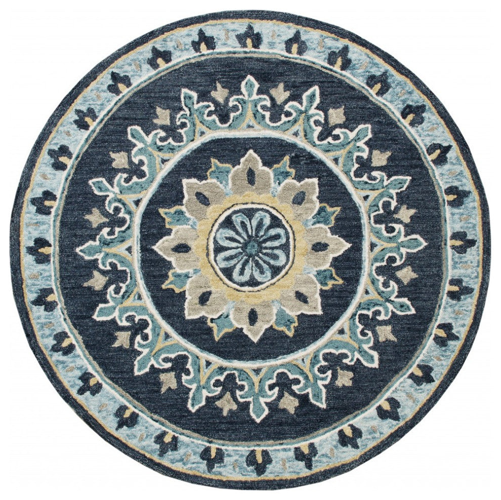 Bring home this Round Blue Floral Medallion Area Rug and give your living space a stunning centerpiece to flaunt. Captivating the beuty of blues with hints of sage, beige, and yellow create an alluring medallion to grab the attention. Hand-hooked with a blend of wool and viscode in the making, this rug ensures durability to stand up to the elements of indoor areas and hold its color and shape for a long time. The low pile construction adds to the soft and smooth surface texture that offers a cozy underfoot for a homey atmosphere. If you lean towards the sophisticated shades of the spectrum with love for traditional styling, this beautiful area rug will be the perfect pick for your home. 84"