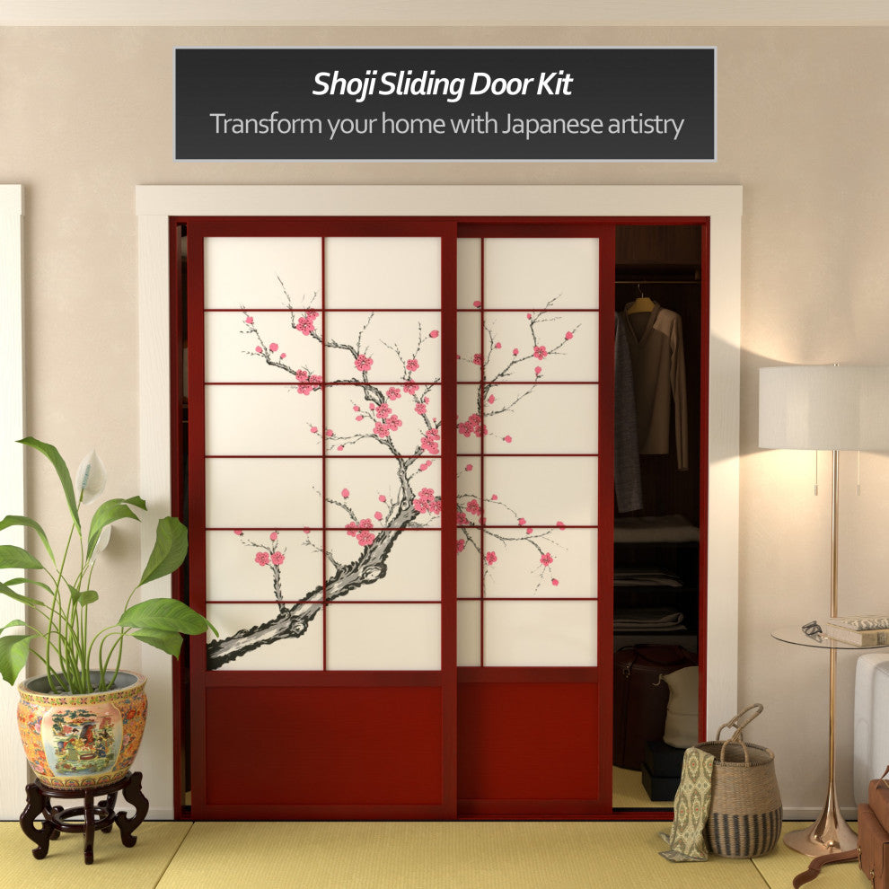 Step into the world of Japanese architectural heritage with the Red Lantern 7 ft. Tall Shoji Sliding Door Kit. Inspired by traditional shoji screens, which have been an integral part of Japanese architecture for centuries, this sliding door set will transform your home with the artistry and philosophy that have shaped Japanese living spaces.Shoji screens have been used in Japanese homes since the 8th century, providing a delicate balance between privacy and natural light. This ancient design philosophy meets modern functionality as the sliding doors offer a contemporary solution for dividing spaces while maintaining an open atmosphere.This kit includes sliding doors, top and bottom tracks, and right and left door jambs. The rough opening (outside dimension) measures approximately 83.00"H x 73.50"W x 3.50"D, with tracks and jambs approximately 1.75" thick x 3.50" deep. Each door measures approximately 36.00"W x 80.00"H x 1.00"D, allowing for a seamless integration into your living space.Our sliding shoji doors invite you to experience the timeless beauty and functionality that have shaped Japanese interiors for generations. Transform your space into a sanctuary of balance and tranquility, where modern design meets ancient wisdom.Reinforced Rice Paper: Crafted with tough, fiber-reinforced washi rice paper, this shoji door kit allows diffused natural light to filter through while ensuring your privacy. The extra strong rice paper stands up to regular usage and foot traffic.Scandinavian Spruce Frame: Crafted from durable yet lightweight spruce wood, these shoji doors boast a sturdy construction that is light to the touch and opens smoothly and effortlessly. An enlarged kickplate area protects the rice paper from the most common bumps and scratches.Dual-track design: The base is equipped with two tracks that enable each shoji door to move freely in either direction, providing seamless and versatile access.Versatile Size and Dimensions: Once assembled the kit is 83" tall x 73 _" wide x 3 _" deep. The tracks and jambs are approx. 1 _" thick. x 3 _" deep. The two doors each measure 36" x 80" x 1"Barn Door Compatible: For those who prefer the aesthetic of barn doors over traditional sliding doors, this kit can easily be adapted with hanging hardware, available at your local hardware retailer.