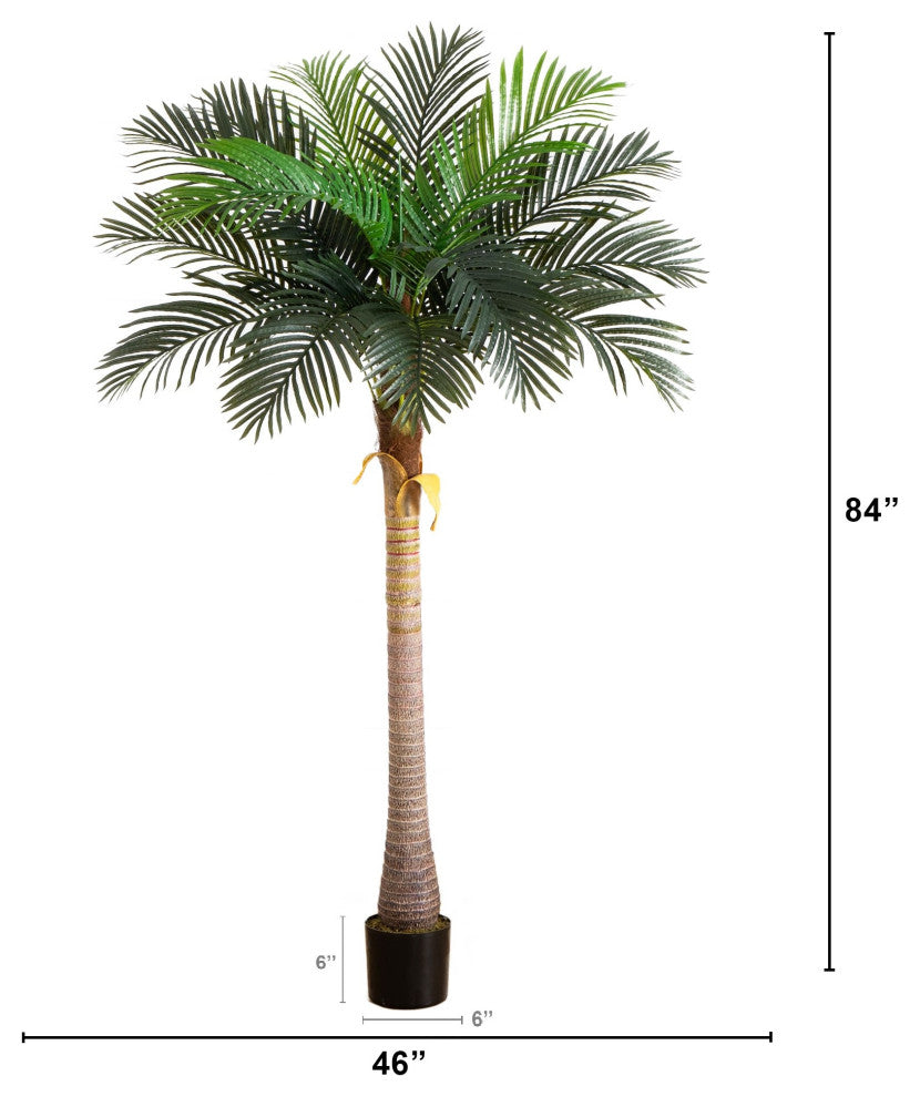 Picture your perfect summer vacation: Where you sun-soak on a hammock, feel the sea breeze hitting your face while sipping on a coconut. Luckily you can now tropic like its hot with this artificial coconut palm tree. It features lush, gorgeous green palm fronds stemming from a life-like trunk. Standing 7-Ft from a black nursery planter, recreate island life in any space like your living room, office bedroom, or apartment. Do you want to feel the sea breeze with this tree? DIY and add to a planter of your choice to fit your style.