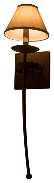 Invite handsome styling that greets a distinctive sophisticated look into your home or business. A Faux Ivory candlelight topped with a Natural Linen Textrene shade is perched atop of a custom tailored bobeche accented with a long slender decorative stem embellished with a ball point accent for a high level of aesthetic appeal. Stunning solid steel hardware is hand forged and hand finished in an Antique Rust hue. Ideal for hallways, foyers and other spaces in homes, restaurants, pubs, hotels and other fine interiors. The fixture is custom crafted by artisans in our manufacturing facility in Yorkville, New York. Customizes, designs and colors are available. The fixture and cUL listed for damp and dry locations.