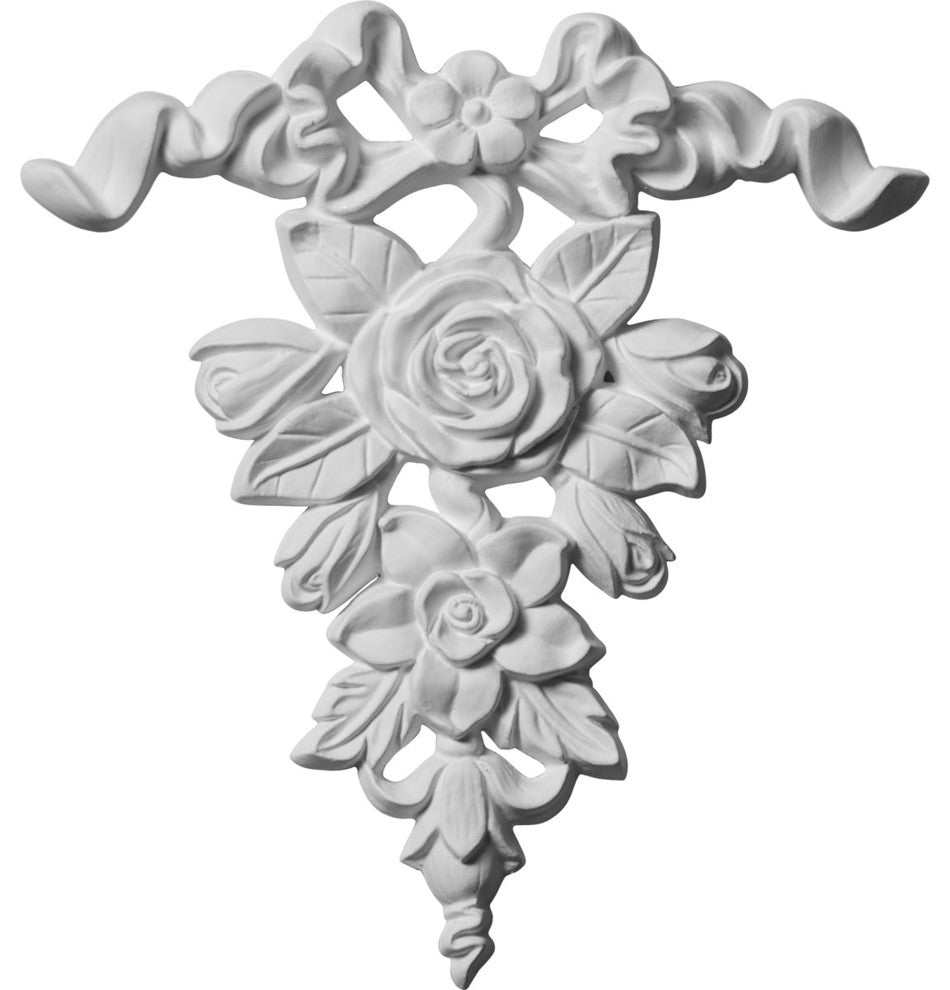 8 1/2"W x 9"H x 3/4"P Versailles Ribbon and Rose Drop Onlay. Our appliques and onlays are the perfect accent pieces to cabinetry, furniture, fireplace mantels, ceilings, and more. Each pattern is carefully crafted after traditional and historical designs. Each polyurethane piece is easily installed, just like wood pieces, with simple glues and finish nails. Another benefit of polyurethane is it will not rot or crack, and is impervious to insect manifestations. It comes to you factory primed and ready for your paint, faux finish, gel stain, marbleizing and more.
