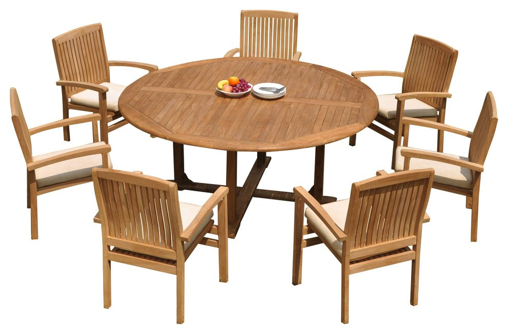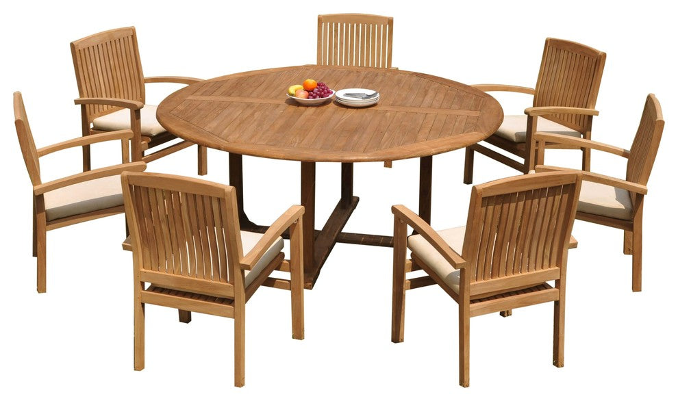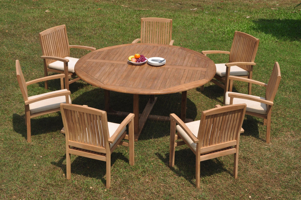 8-Piece Outdoor Teak Dining Set: 72" Round Table, 7 Wave Stacking Arm Chairs